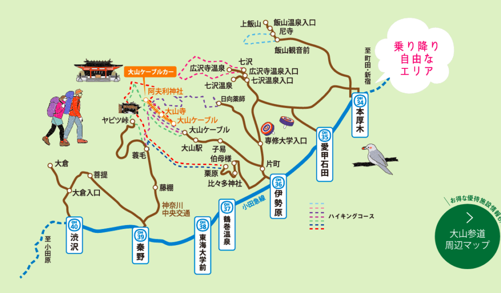小田急線の出発駅から、本厚木〜渋沢までの小田急線区間とそれらの駅から発着するバス、さらには、阿夫利神社に行くための大山ケーブルの乗車料がセットになったチケットである。