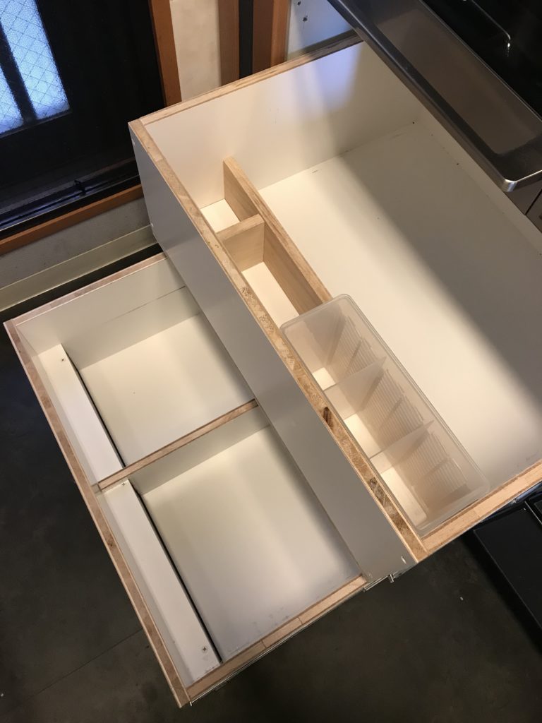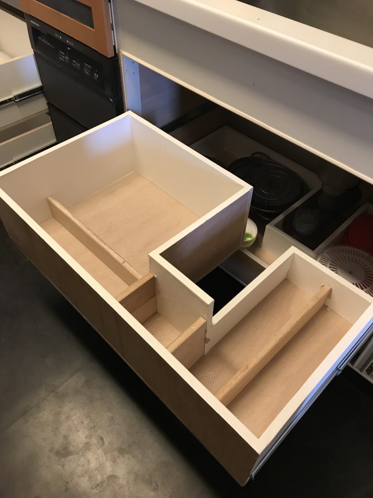 キッチン道具をジャストサイズで収納するなら、端材利用のオーダー仕切りだね。