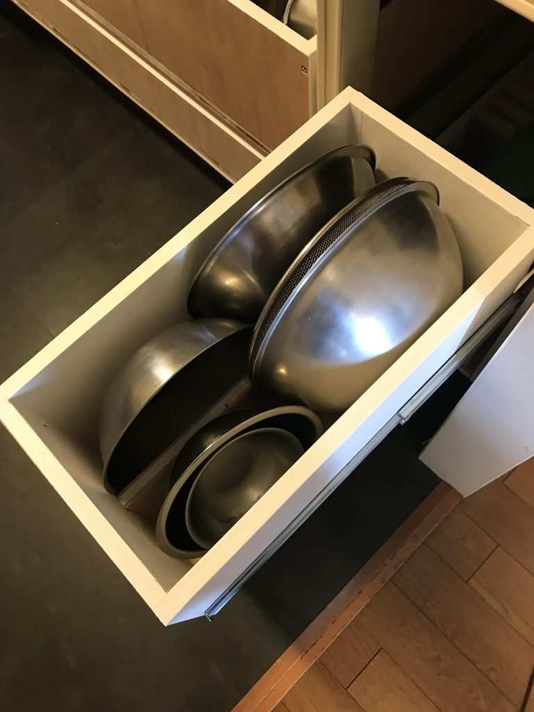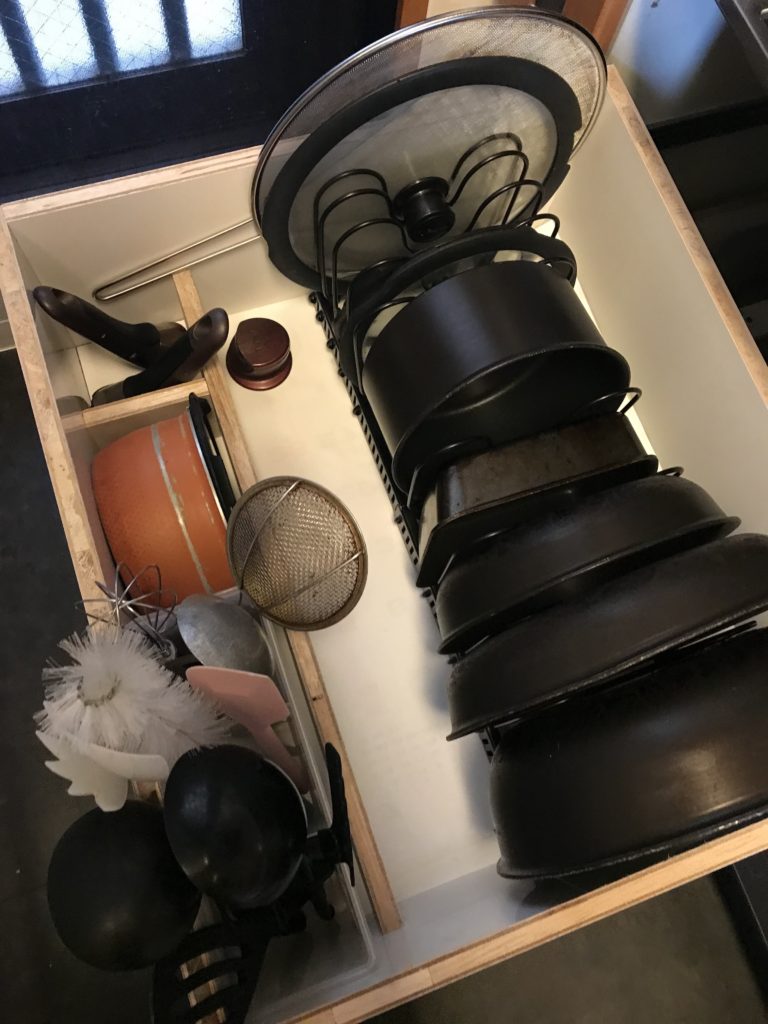 とても綺麗に仕上がるのだが、収納するフライパンとか鍋とかとそのプラスチックボックスとのサイズを合わせるのを苦労しているみたい。