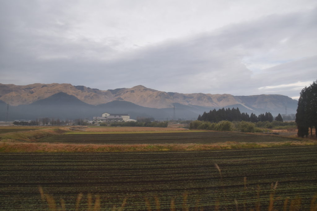 阿蘇駅近くになったら、阿蘇山のカルデラ内に入ったようで、遠くに外輪山がグルリと見える。