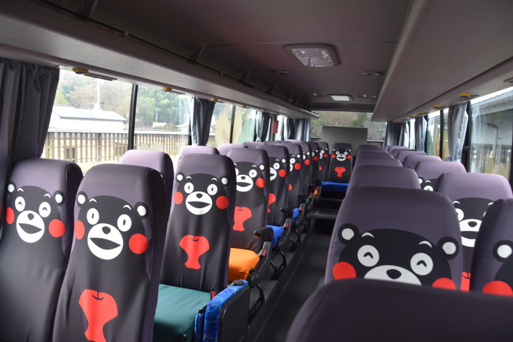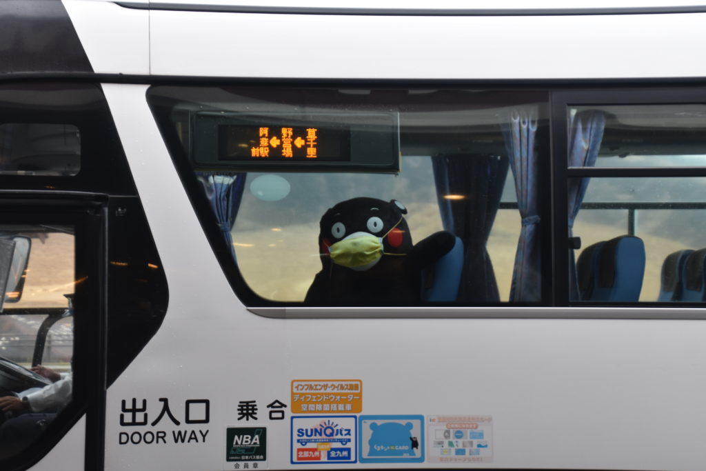おっ、バスが来た。くまもんが乗ってるではないか。それもたくさん。